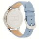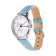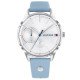 Mouvement multifonctionÉpaisseur du boîtier 8,3mmCadran Sunray argent blancBracelet en cuir bleuRésistance à l\'eau 3 ATM