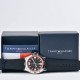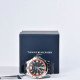 Montre en acier inoxydable avec bracelet côtelé à logo embossé, logo du drapeau à 12 heures et graphique en forme de réticule au centre du cadran.